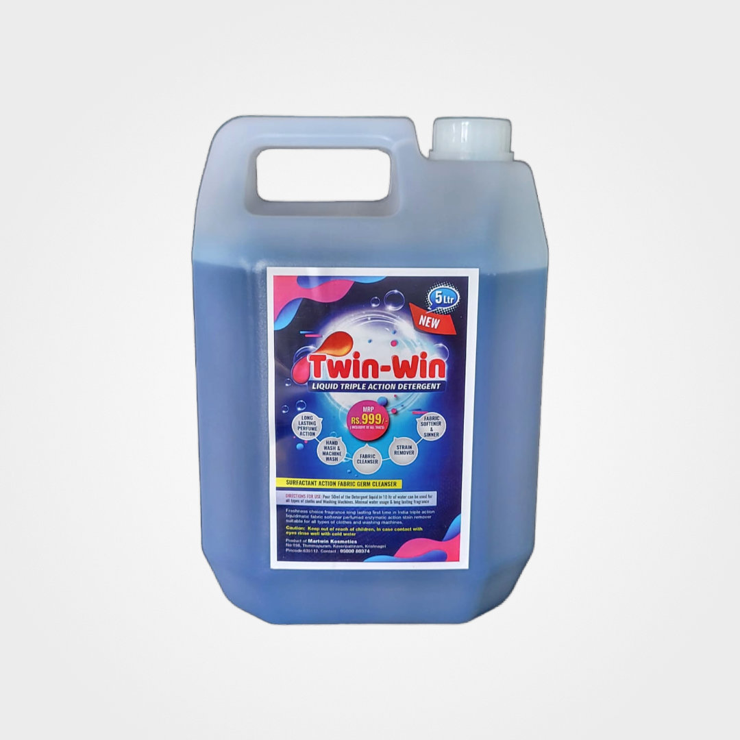 Twin win Detergent Liquid is a high-performance laundry solution designed to tackle tough stains and dirt effectively. Its concentrated formula ensures deep cleaning while being gentle on fabrics, leaving them fresh, bright, and soft. The 5 L pack is perfect for households, commercial laundries, or offices requiring frequent washing.